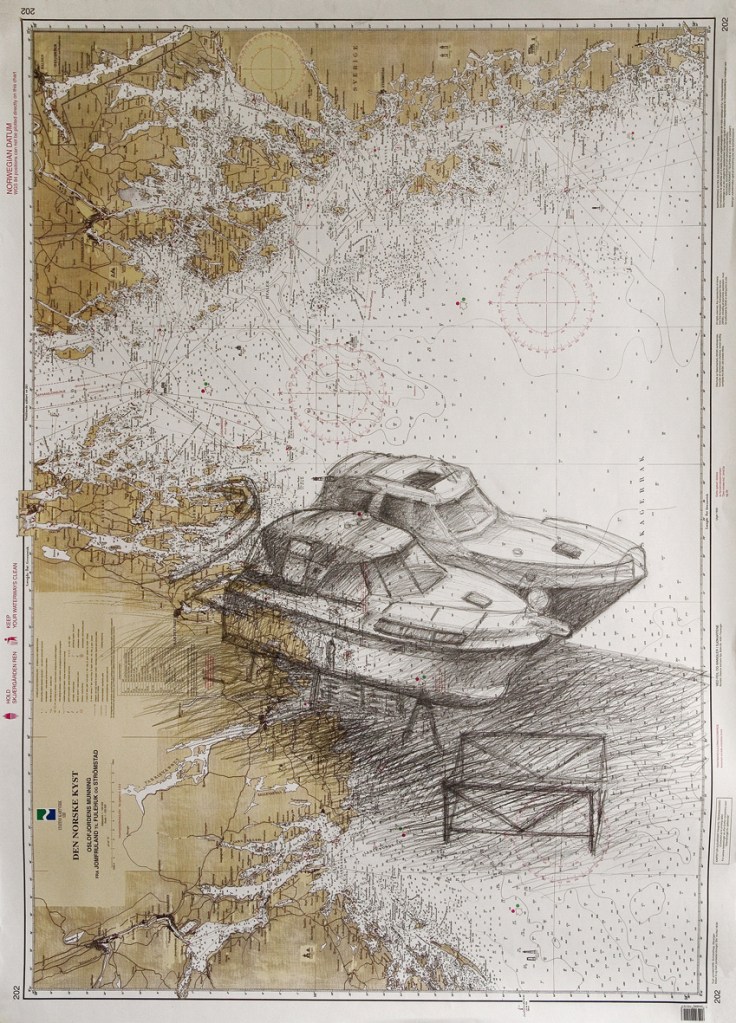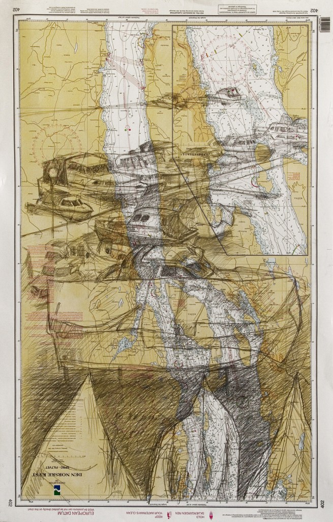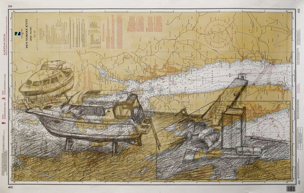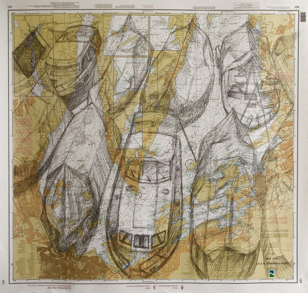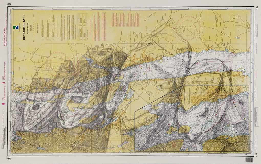 «Den norske kyst», tegning med grafittpenn på originale sjøkart, 13 stk. variable størrelser, 2013/2014