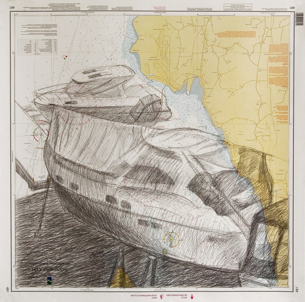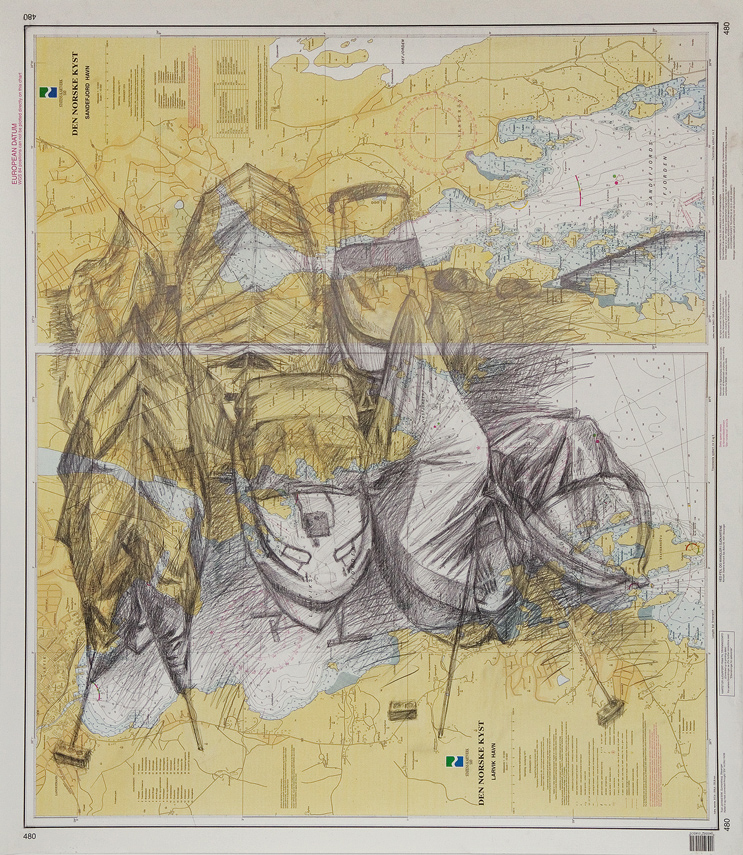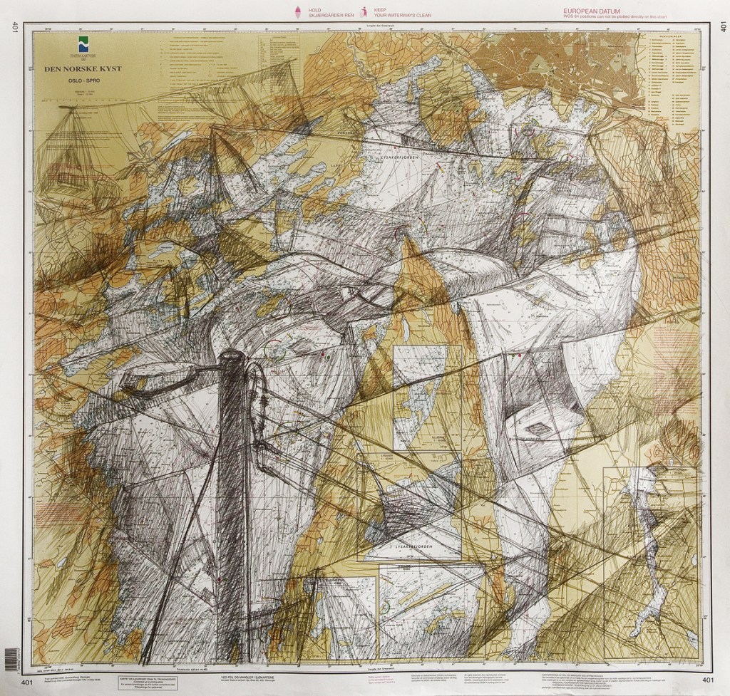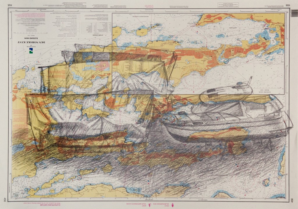 «Den norske kyst», tegning med grafittpenn på originale sjøkart, 13 stk. variable størrelser, 2013/2014