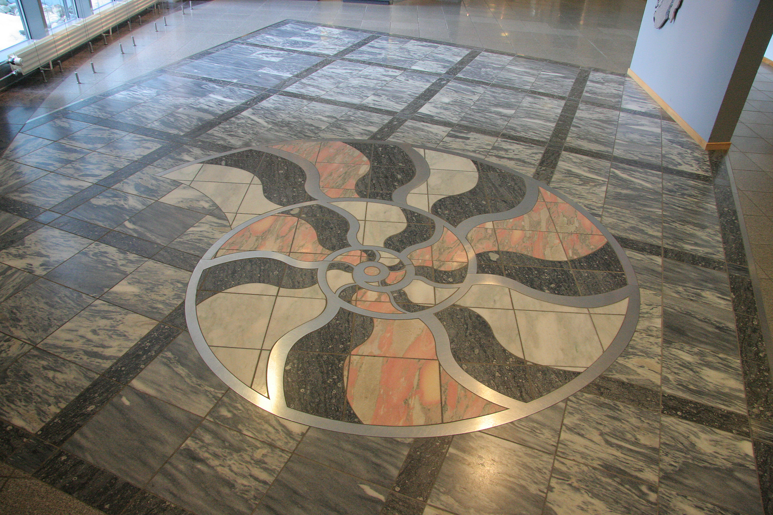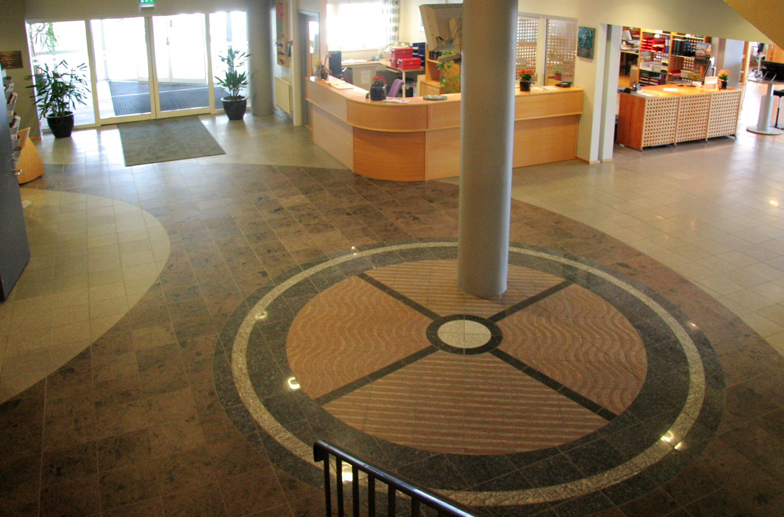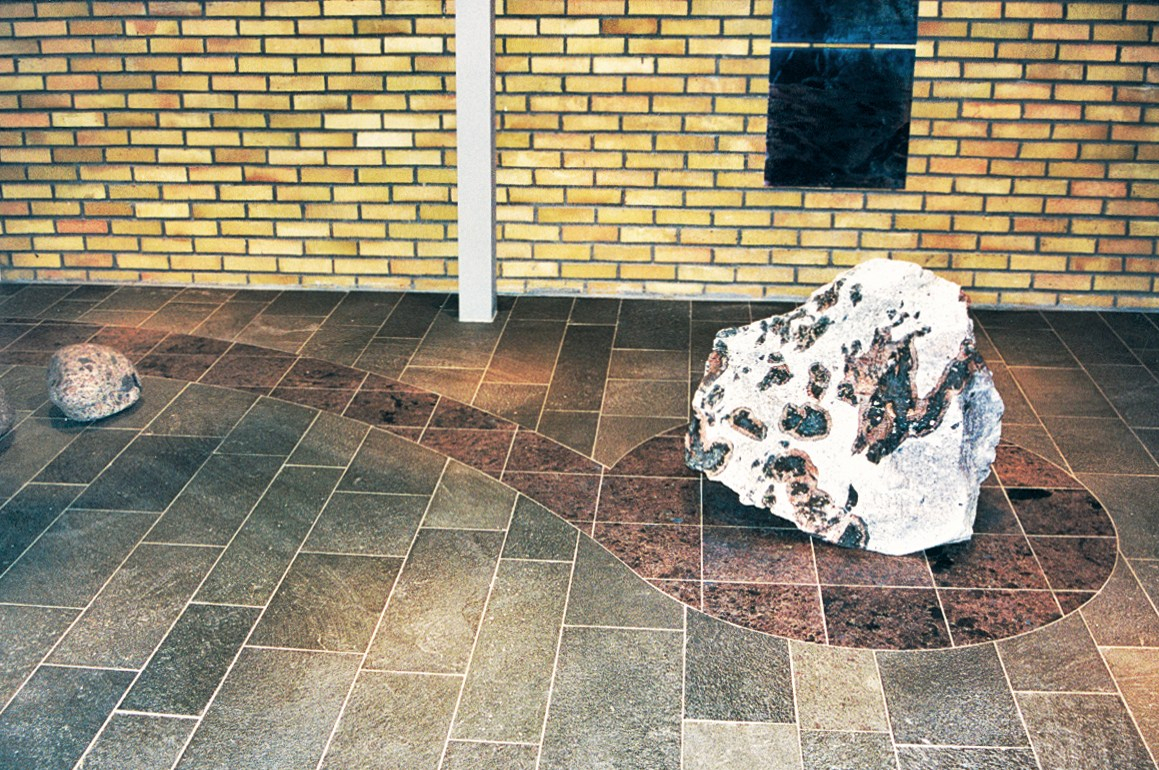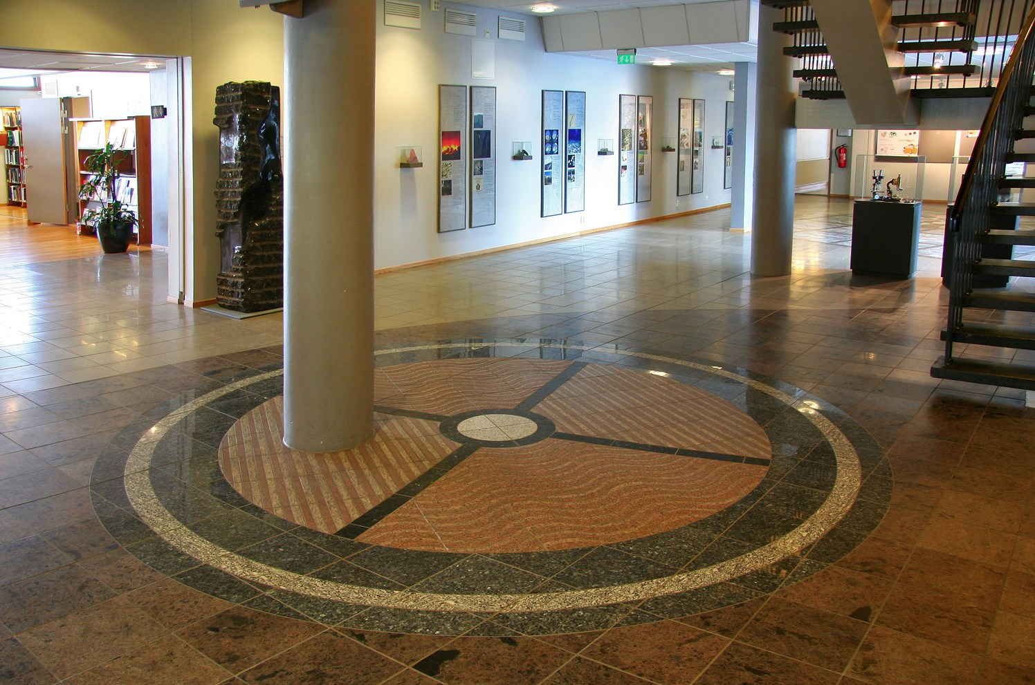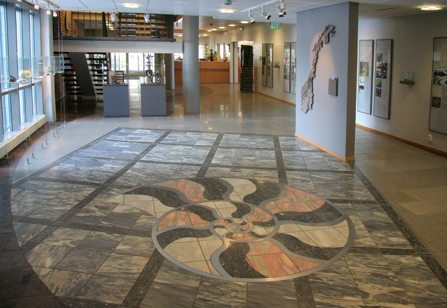 • Rød bølgeform i gulvet følger et langstrakt/påbygd rom og omfavner tre soner: Emne (vindfang), Retninger (mosaikk I) og Tiden (mosaikk II).
