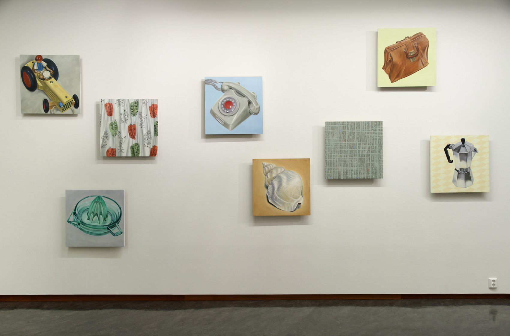 «Rekonstruksjoner», olje på treplater, maleriserie: 8 stk. à 60 x 60 cm, 2009/2010.