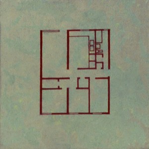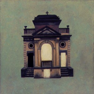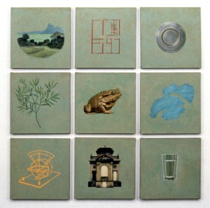 “Rekonstruksjoner”, 2010, olje på treplater, maleriserie: 8 (60 x 60 cm). Utstillingsfolder: “Pendel — malerier” [slideshow] Malerier 1996≫