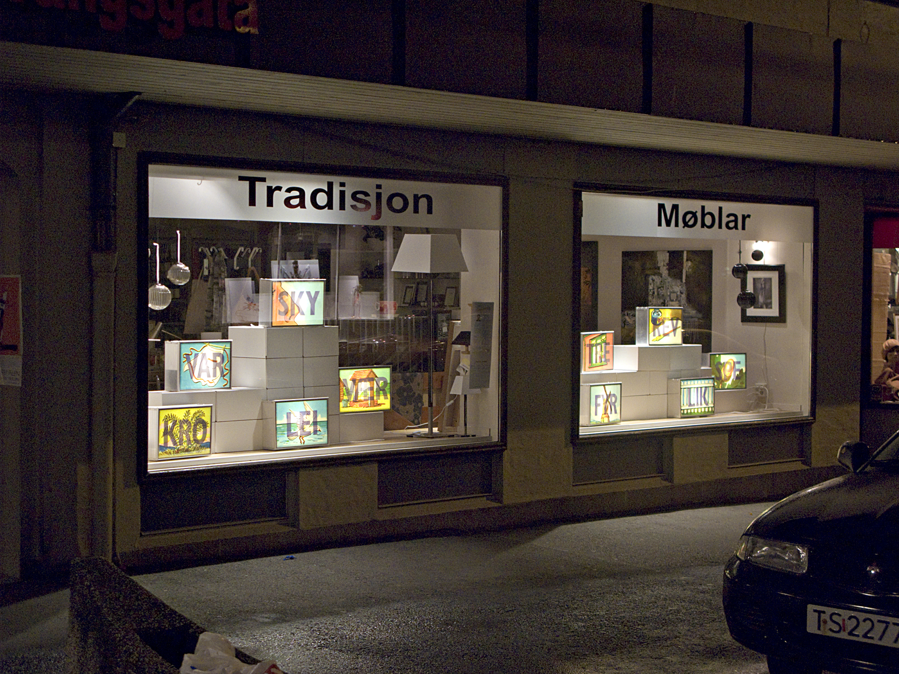 • Installasjon vist i to av vinduene til møbel- og interiørbutikken Tebe i Voss sentrum.
